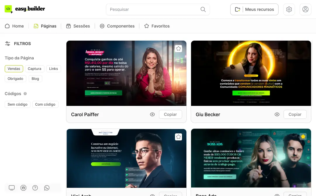 Páginas, botões, seções e códigos — tudo com filtros estilo Freepik. Copiou da extensão, colou no Elementor. Fim.